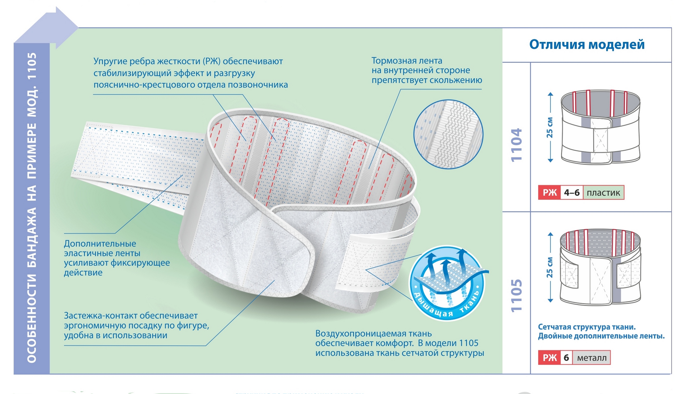 - Дополнительные двойные ленты-«стяжки» из плотной эластичной ткани, растяжимой только в продольном направлении, способствуют равномерному распределению давления.